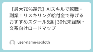 副業 【最大70%還元】AIスキルで転職・副業!リスキリング給付金で稼げるおすすめスクール5選 | 30代未経験・文系向けロードマップ 30代未経験・文系がAIスキルで転職・副業を成功させた実体験を公開。リスキリング給付金(最大70%還元)で費用を抑え、本当に稼げるおすすめスクール5選を徹底比較! 2025.12.06 副業転職